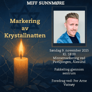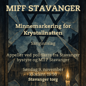Minnemarkering for Krystallnatten – Stavanger, 9. november Tid: Søndag 9. november kl. 19.30Sted: Stavanger torgArrangør: MIFF Stavanger Vi står sammen med det jødiske folket Natt til 10. november 1938 opplevde jødene i Tyskland den såkalte November-pogromen, kjent som Krystallnatten.Synagoger ble brent, jødisk eiendom ble ødelagt, og tusenvis av jøder ble arrestert og sendt til konsentrasjonsleirer. […]