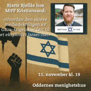 MIFF Kristiansand inviterer til et åpent møte 📅 Tid: Tirsdag 11. november 2025 kl. 19.00📍 Sted: Oddernes menighetshus Hvordan den skjeve mediedekningen av Gaza-krigen har ført til et eksplosivt Israel-hat Foredrag ved: Bjarte Bjellås, journalist i MIFF De siste to årene har en rekke feilaktige påstander om Israels krigføring på Gazastripen preget mediene.I dette foredraget […]