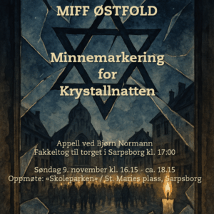 Tid: Søndag 9. november kl. 16.15 – ca. 18.15Sted: «Skoleparken» / St. Maries plass, SarpsborgArrangør: MIFF ØstfoldVarighet: Ca. 2 timer Minnemarkering og solidaritet med Israel MIFF Østfold inviterer til fakkeltog i Sarpsborg for å markere minnet om Novemberpogromen («Krystallnatten») – natten da jøder over hele Tyskland ble utsatt for vold, plyndring og brannstiftelse i 1938. […]