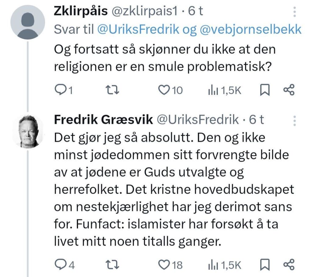 Fredrik Græsvik, som i mange år var TV2s Midtøsten-korrespondent, skriver på det sosiale mediet X at jødedommen har et forvrengt bilde av hva jødene er. Det hele startet med et innlegg om karikaturstriden som herjet for 20 år siden.