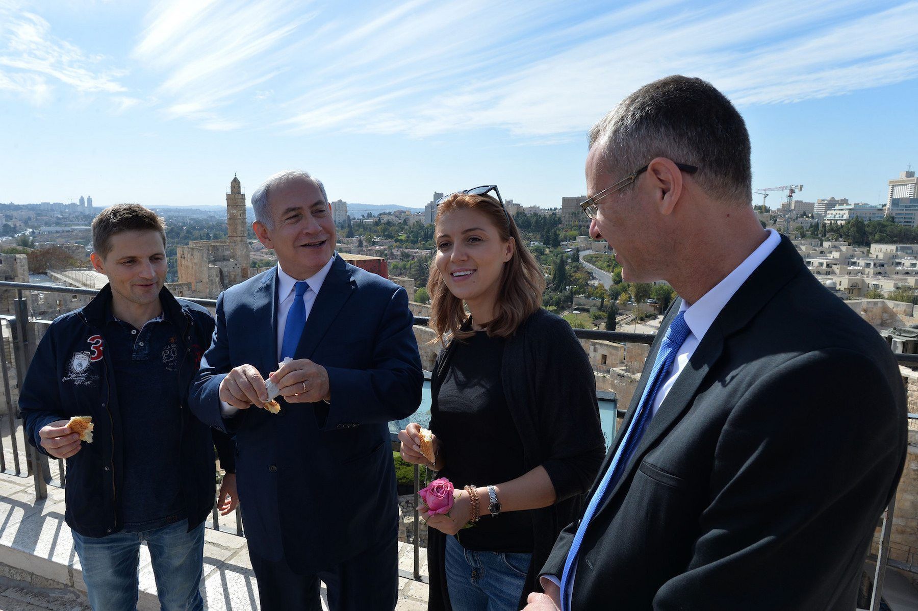 De rumenske turistene Mihai Georgescu (t.v.) og Ioana Isac fikk en overraskende start på Israel-ferien. De fikk en personlig omvisning i Jerusalem av statsminister Benjamin Netanyahu. Til høyre turistminister Yair Levin. (Foto: Kobi Gideon/Flickr)