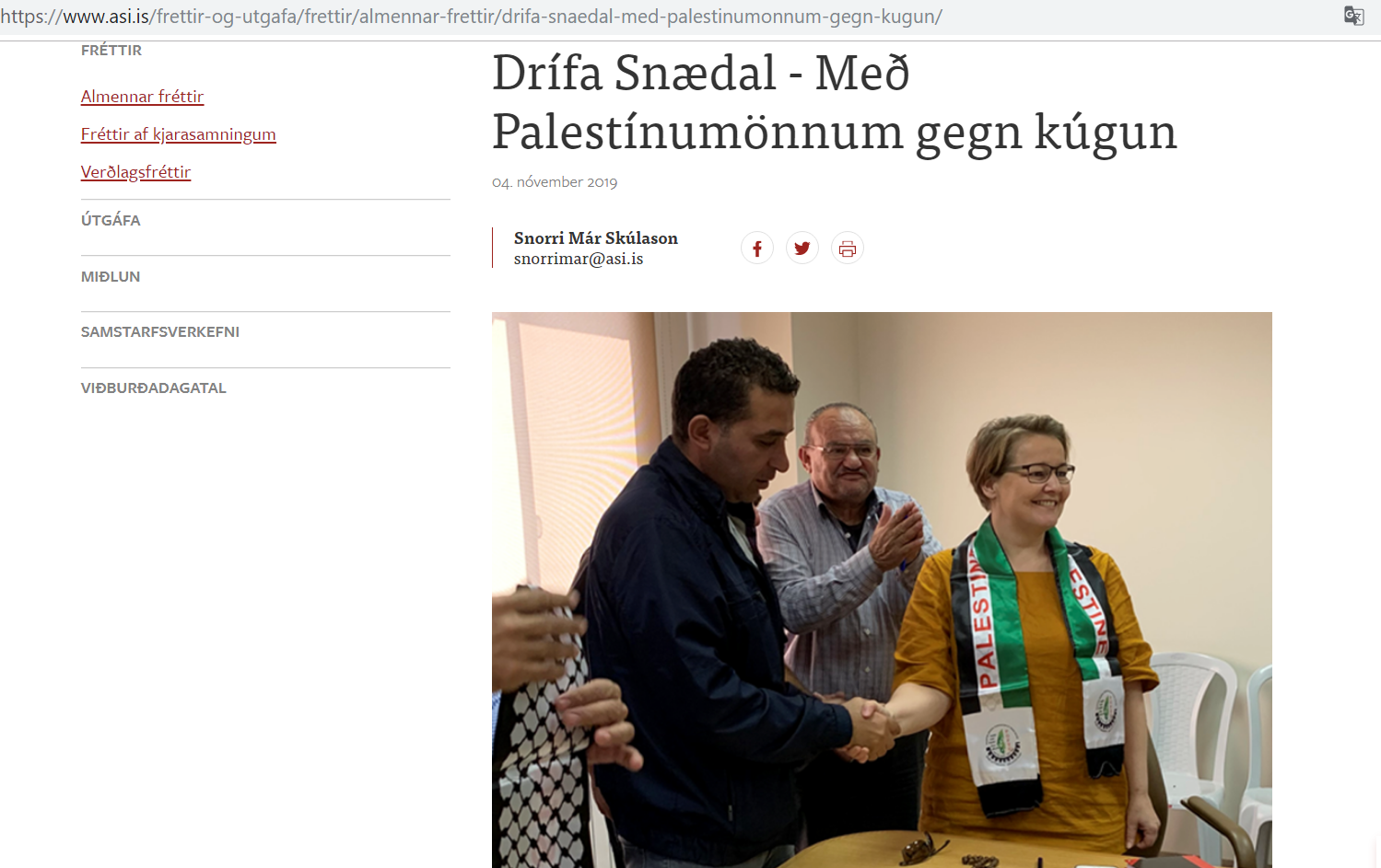 ASIs leder Drífa Snædal er avbildet i artikkelen med et skjerf som bærer logoen til Palestinian General Federation of Trade Unions (PGFTU). Israel er slettet fra kartet. (Skjermdump fra asi.is)