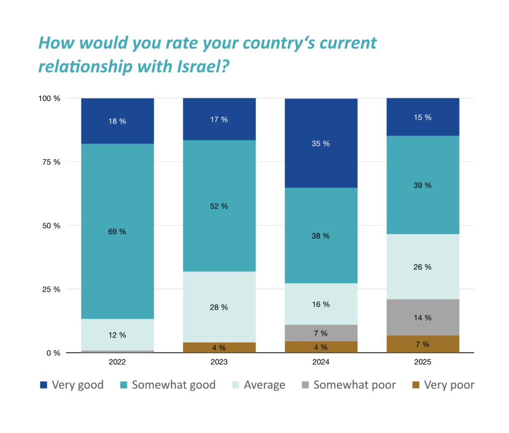 Det har vært en økning i andelen som ser sitt lands forhold til Israel som noe dårlig eller svært dårlig, og en nedgang i andelen som ser på forholdet som godt.
