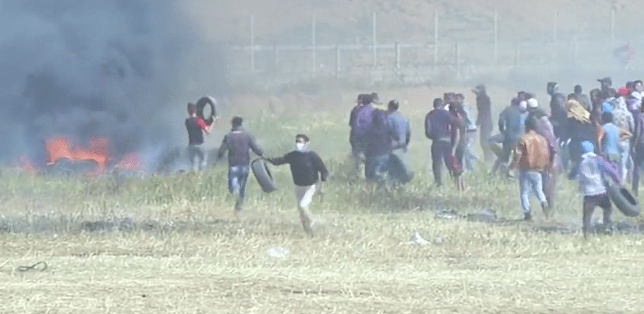Palestinere setter fyr på dekk like ved grensen. I bakgrunnen sees de israelske grensevaktene. (Foto: Skjermdump)