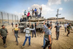 Palestinere tar kontroll over en israelsk stridsvogn under 7. oktober-angrepet. (Foto: Flash90)