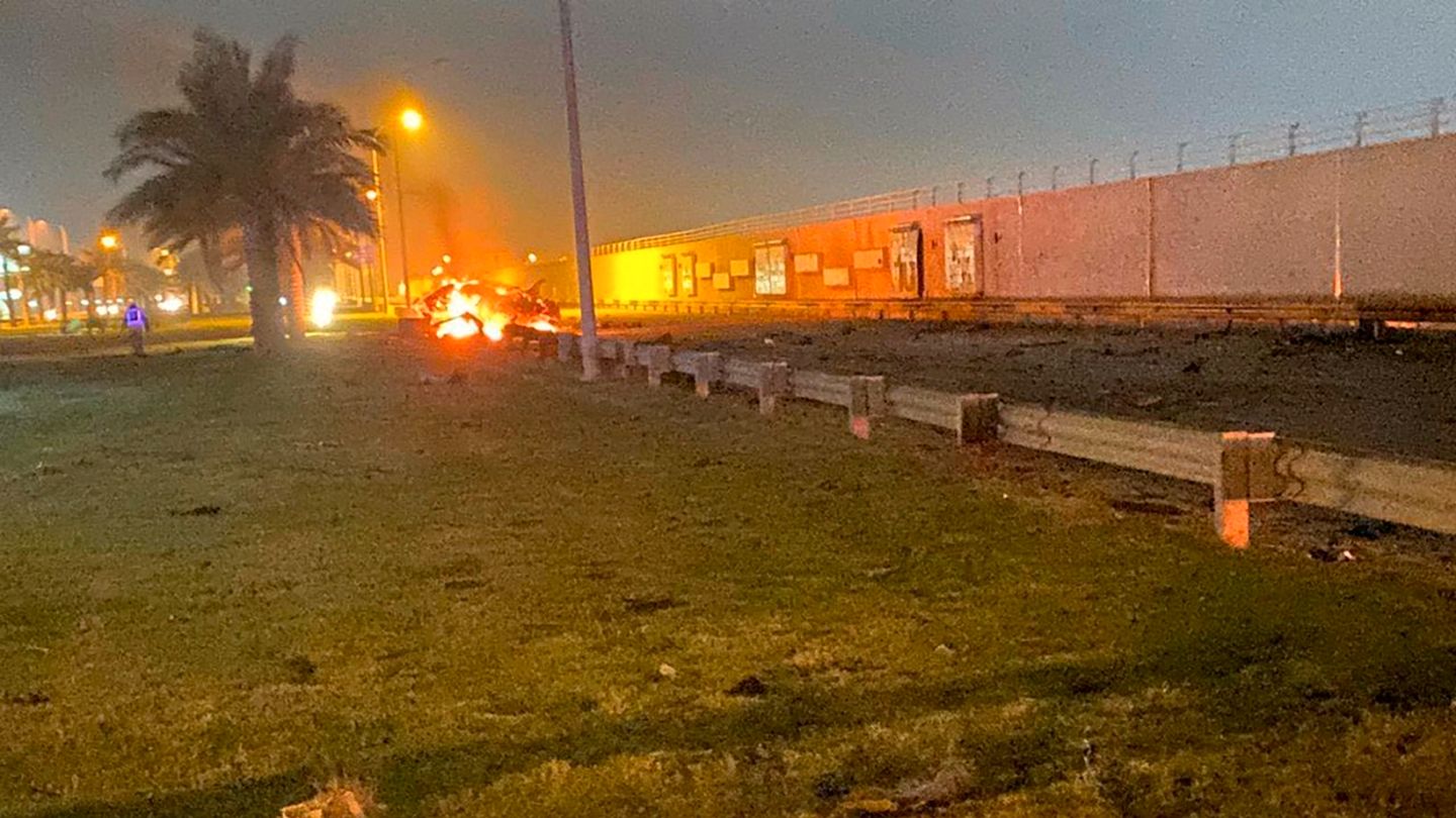 Et brennende bilvrak ved flyplassen i Bagdad. Her ble Qassem Soleimani og flere andre drept. (Foto: Iraq Prime Minister Press Office)