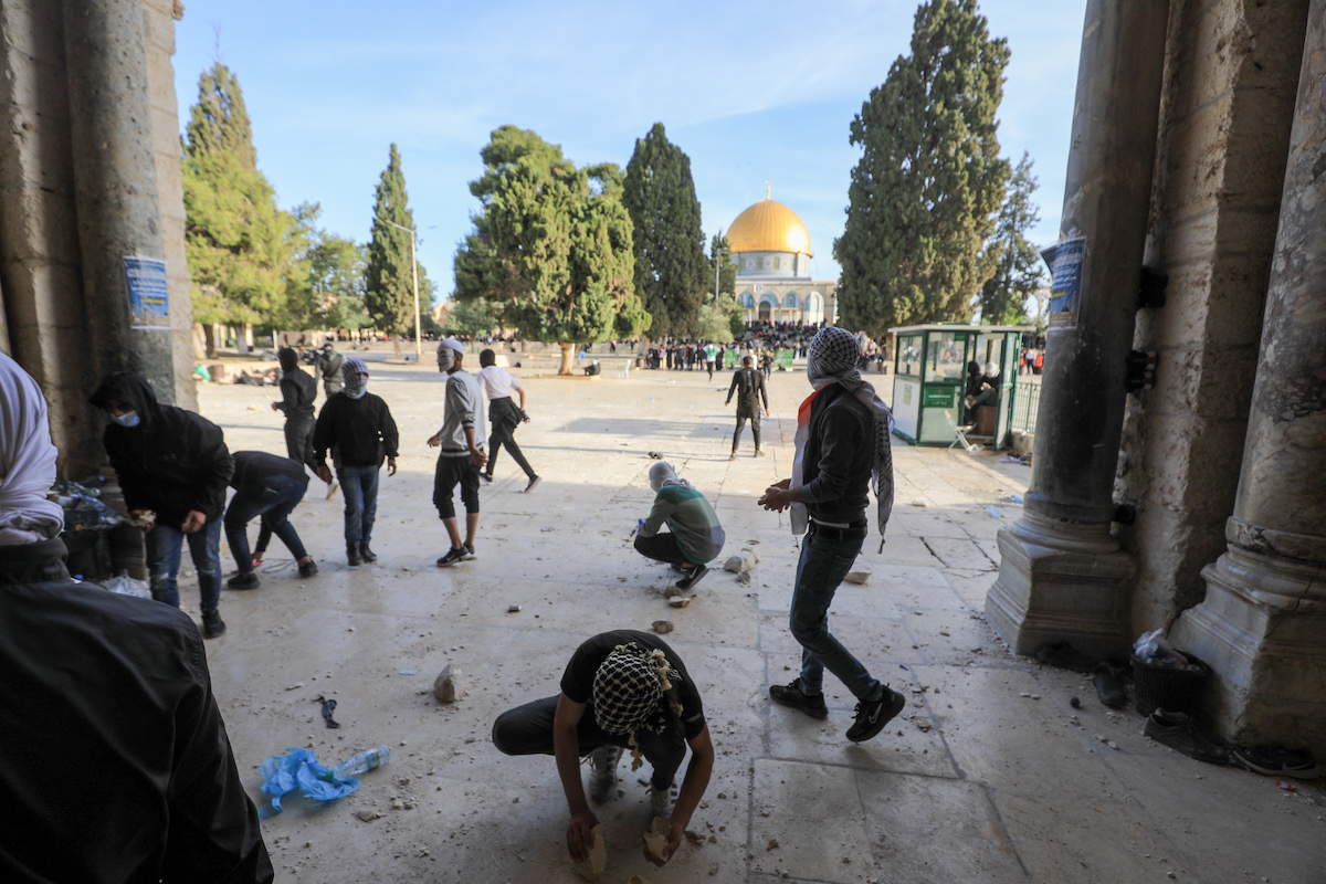 Maskerte palestinske steinkastere utenfor Al-Aqsa-moskeen i Jerusalem fredag 22. april 2022. (Foto: Flash90)