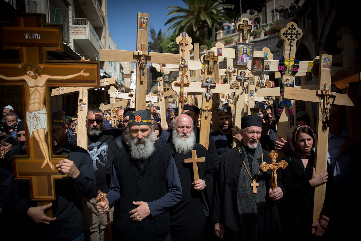 Ortodokse kristne går langs Via Dolorosa i Gamlebyen i Jerusalem i forbindelse med påsken 2018. (Foto: Miriam Alster/Flash90)