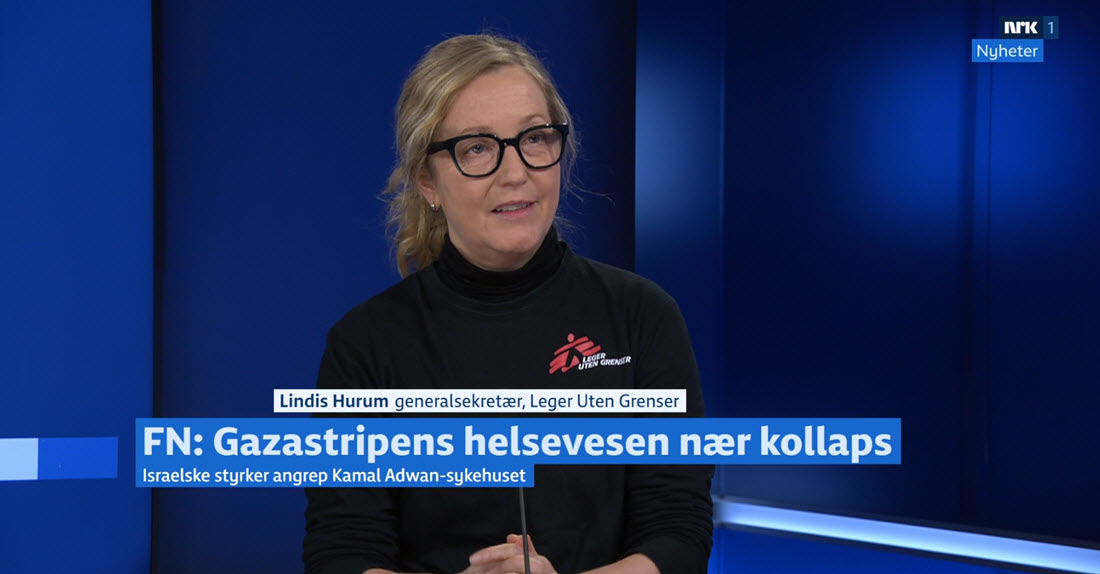 Lindis Hurum, generalsekretær i Leger Uten Grenser, på NRK Nyheter 3. januar 2025. (Skjermdump fra tv.nrk.no)