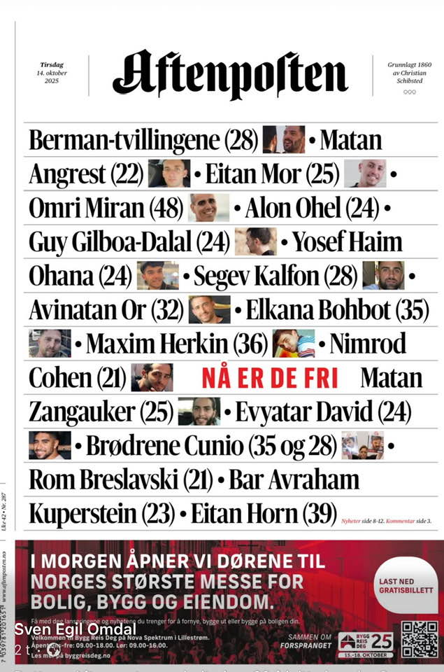 Mandag 13. oktober ble de siste 20 gjenlevende gislene løslatt etter 738 dager i Hamas sitt fangenskap. Dagen etter hadde avisen Aftenposten bilde og navn på alle de 20 løslatte gislene på forsiden sin. Det er første gang de israelske gislene blir løftet frem på en slik måte.