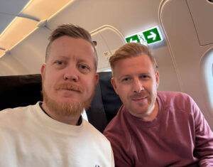 Bjarte Bjellås og Per Arne Vatnøy på vei til Israel torsdag 30. oktober 2025. (Foto: Bjarte Bjellås, MIFF)