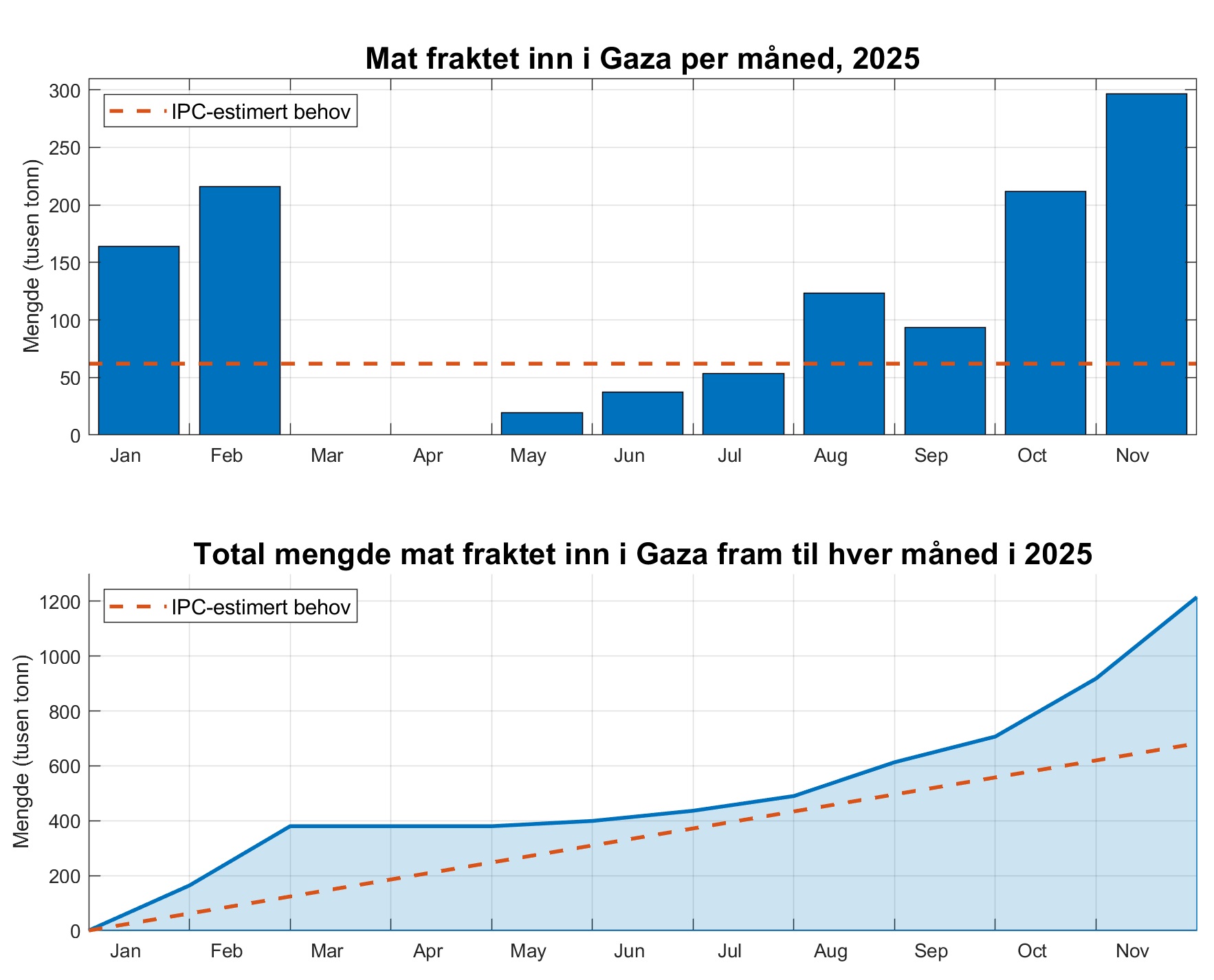 Som grafen over viser, økte matleveranser til Gaza dramatisk etter våpenhvilen i oktober. Hver dag kommer det nå rundt 600 lastebiler med nødhjelp inn til Gazastripen, som utgjør 4200 lastebiler i uka. Det er 3-4 ganger så mye som trengs for å dekke det humanitære behovet i Gaza, ifølge israelske tjenestemenn.