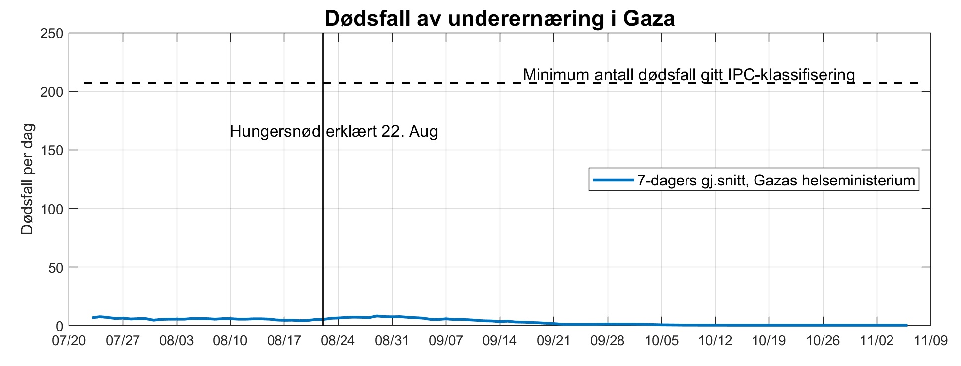 Men allerede i september 2025 var det klart, på grunnlag av tall fra palestinernes helsedepartement (som er kontrollert av Hamas), at situasjonen på Gaza-stripen ikke var i nærheten av å kvalifisere til FNs definisjon på hungersnød