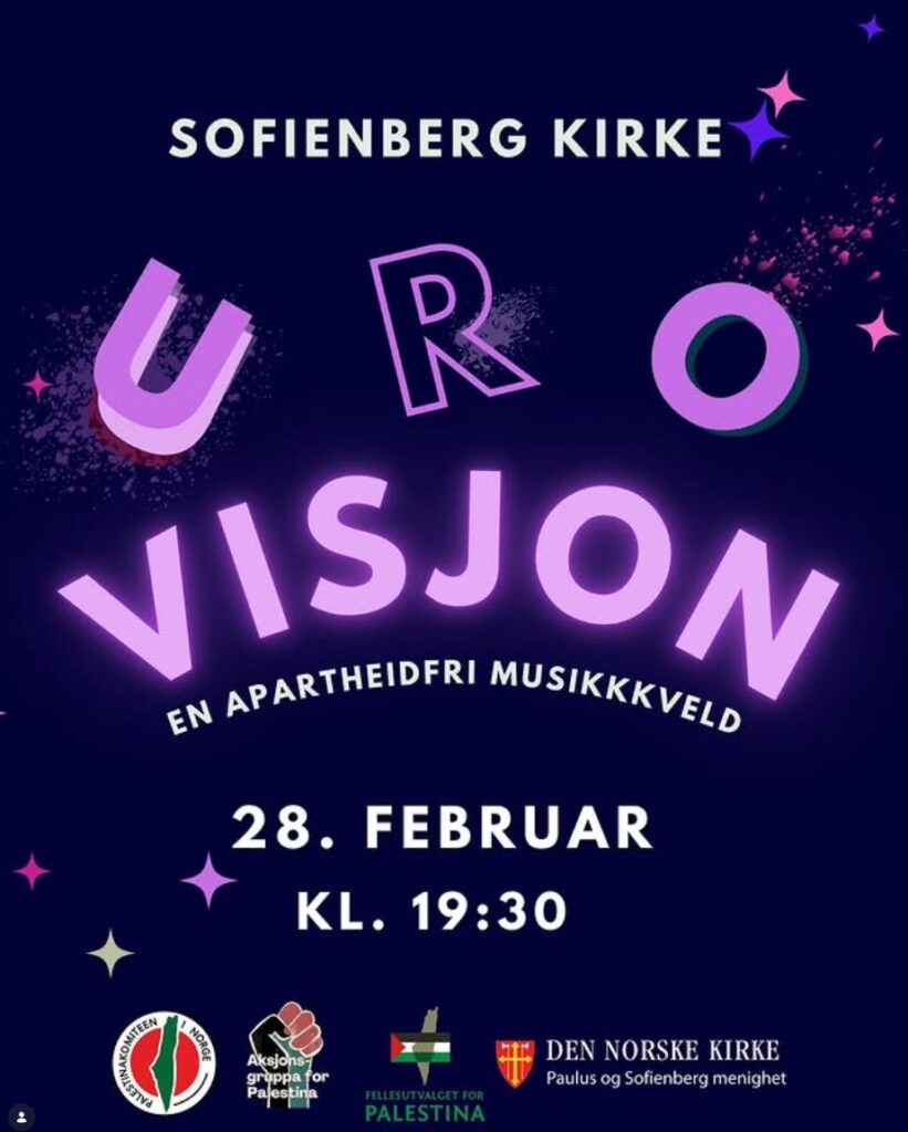 28. februar arrangerer Palestinakomiteen, Aksjonsgruppa for Palestina og Fellesutvalget for Palestina en konsert i Oslo. Den såkalte «apartheidfrie musikkvelden» skal avholdes i Sofienberg kirke, og Den norske kirke ved Paulus og Sofienberg menighet står med logoen sin blant arrangørene.