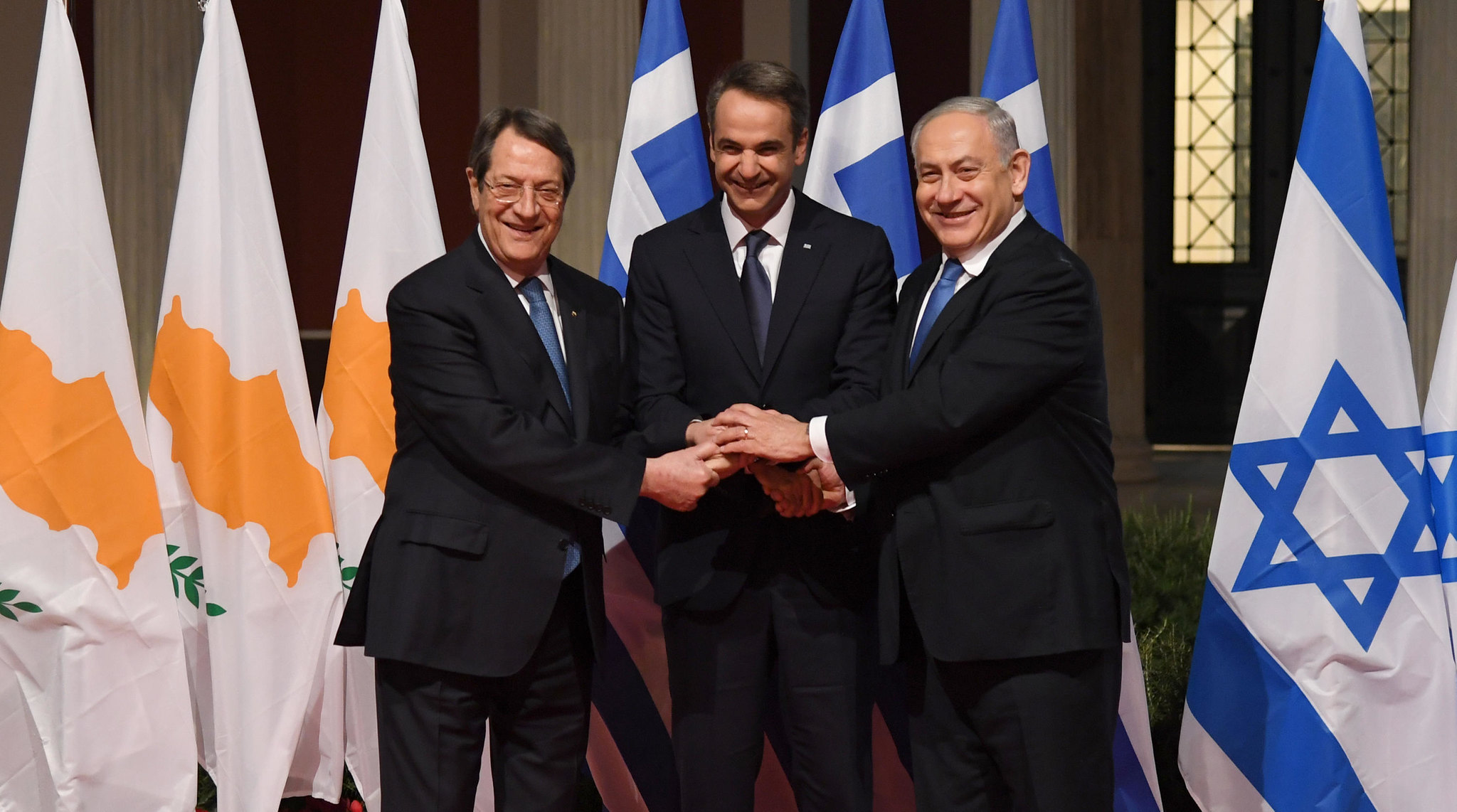 Kypros’ president Nicos Anastasiades, den greske statsministeren Kyriaskos Mitsotakis og Israels statsminister Benjamin Netanyahu markerer at de tre landene er enige om å bygge en felles gassrørledning til Europa. (Foto: Haim Zach/GPO)