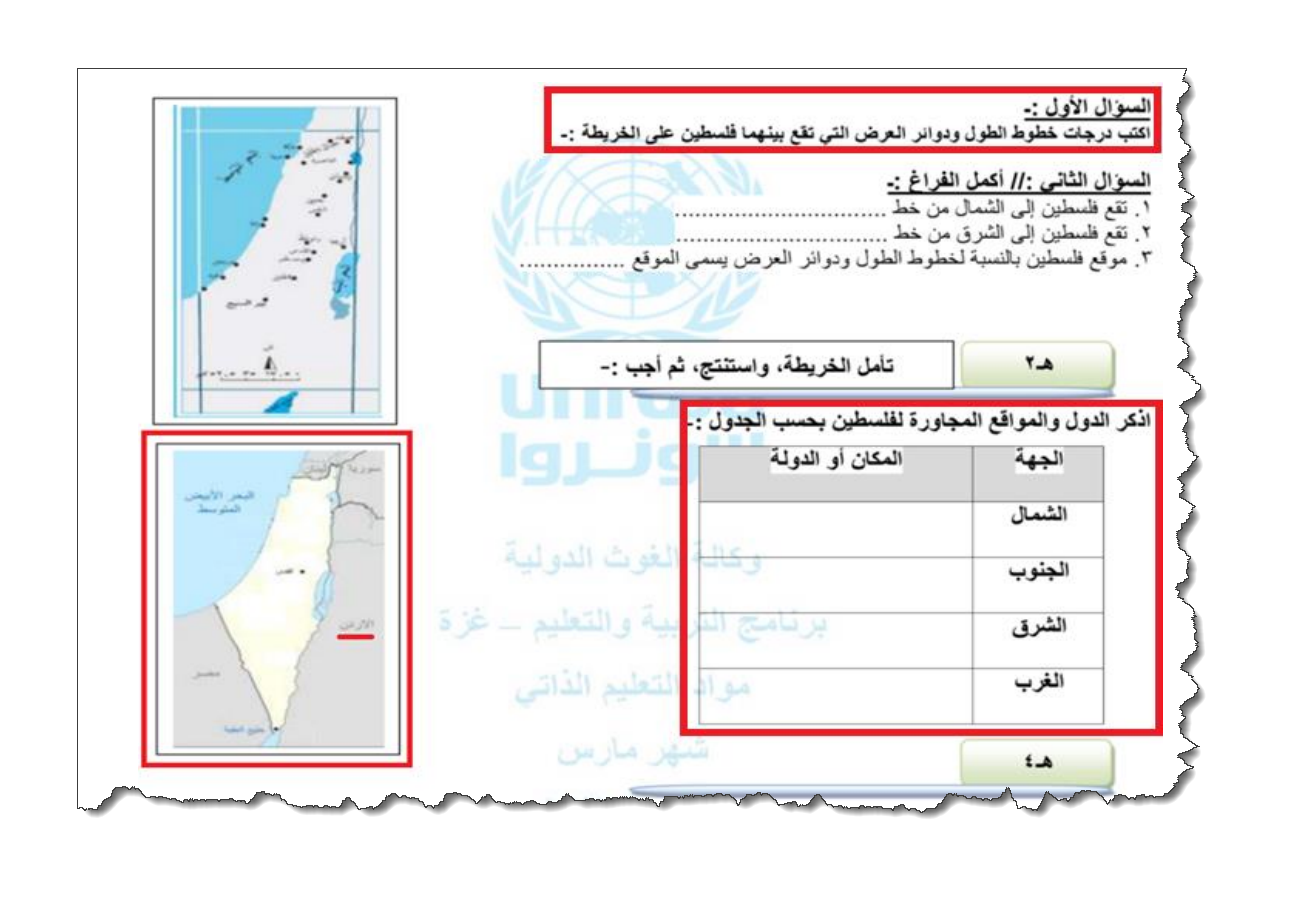 Eksempel på skolemateriell fra UNRWA hvor Israel er slettet fra kartet.