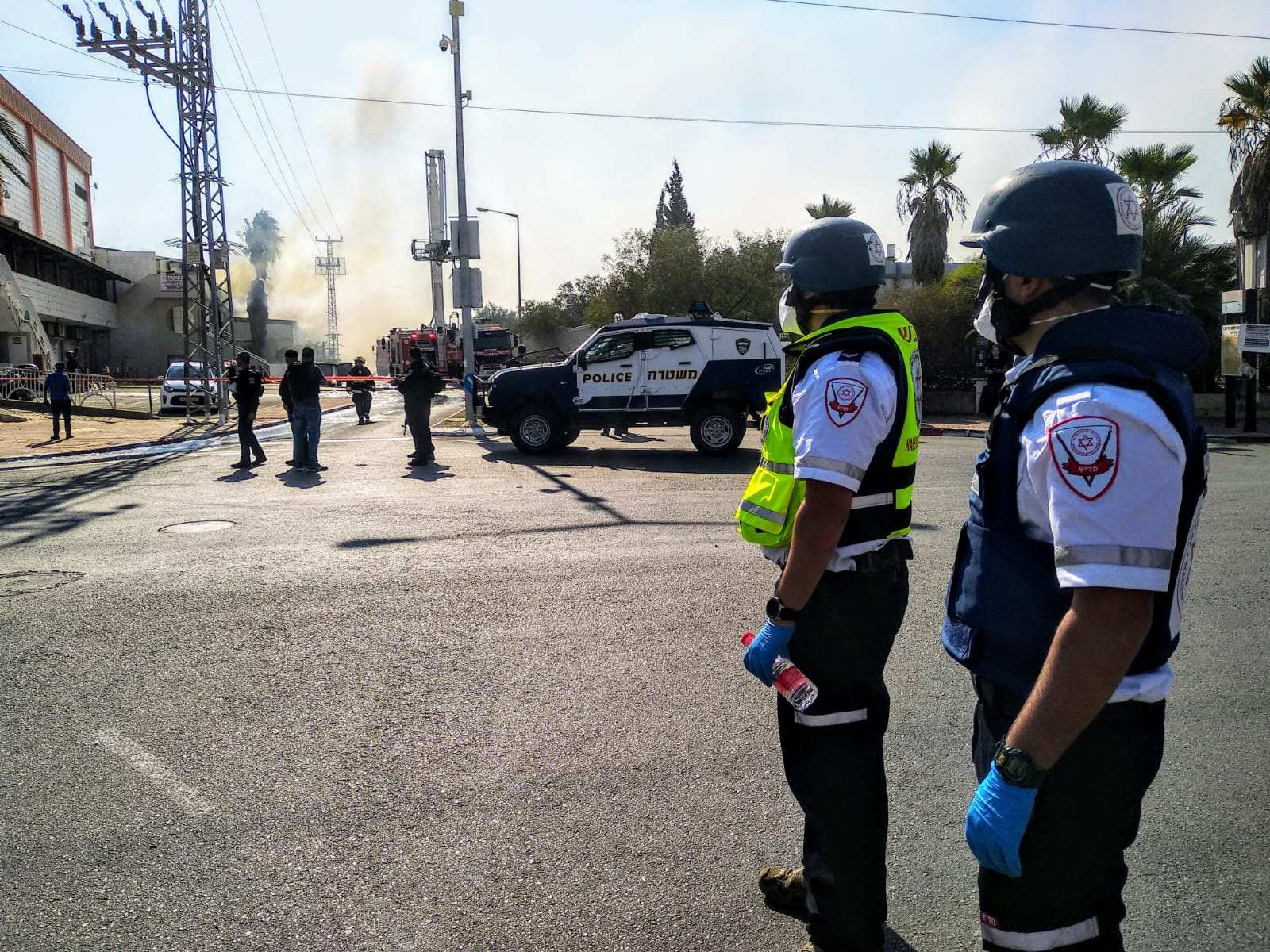 Redningsmannskaper på stedet hvor en rakett har eksplodert i byen Sderot. Dette var før våpenhvilen. (Foto: Magen David Adom)