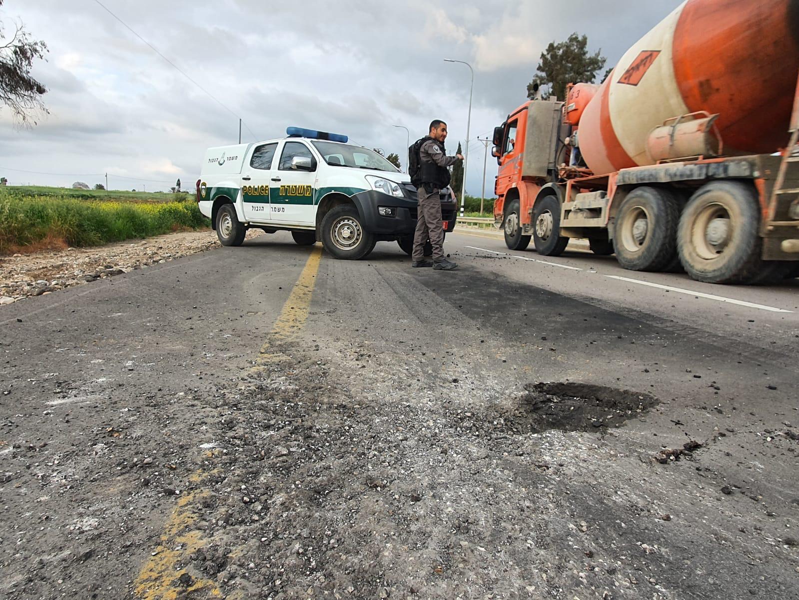 Politiet er på stedet hvor en rakett traff en vei i Sør-Israel etter kraftige rakettangrep mandag 24. februar. (Foto: Politiet)