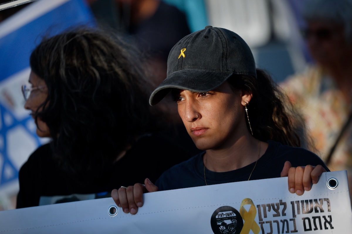 Arbel Yehoud på en markering for gislene 7. august 2025. Da satt kjæresten fortsatt i fangenskap. (Foto: Flash90)