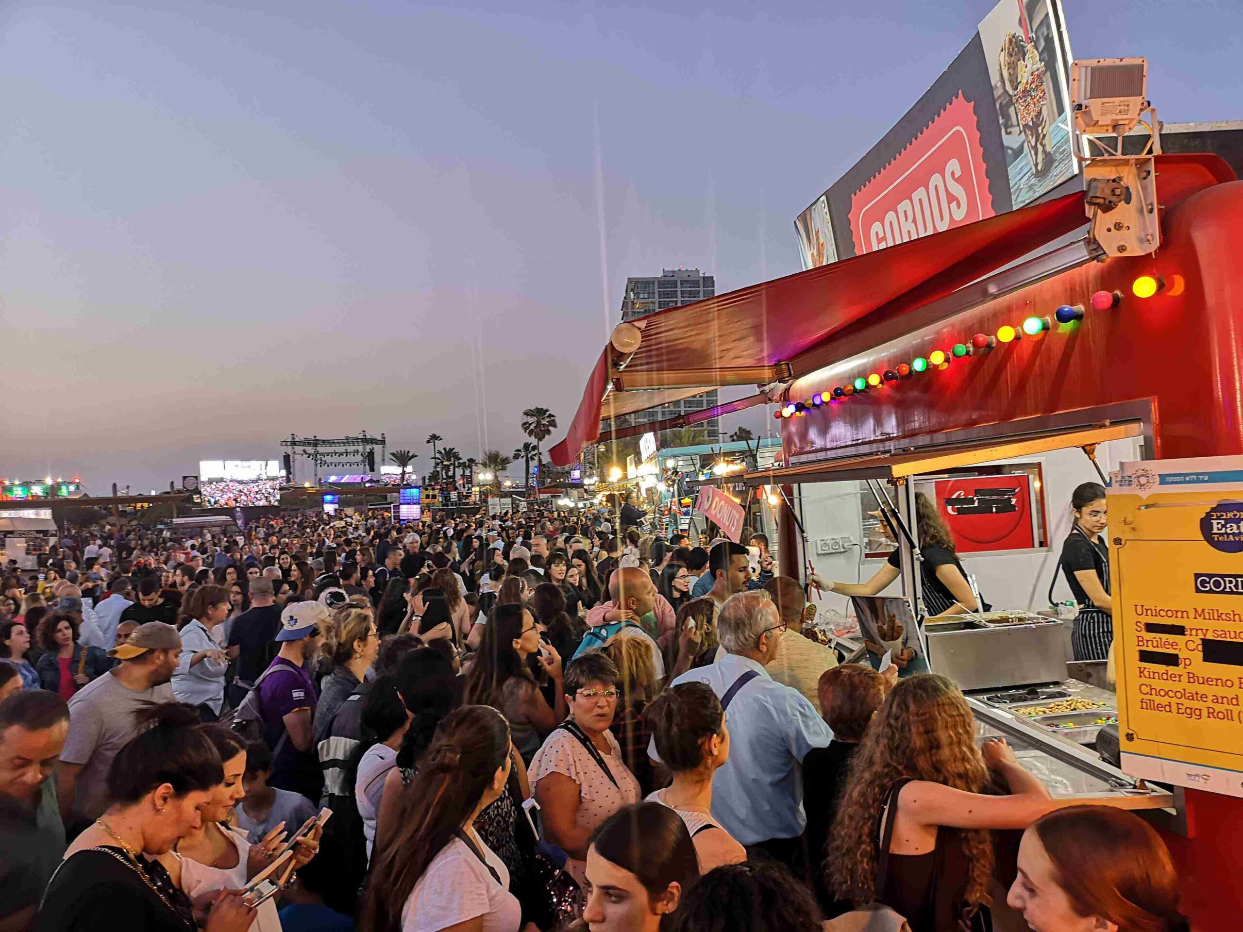 25.000 mennesker er samlet på Eurovision-village i Tel Aviv. Her får man mat, drikke og underholdning. (Foto: Bjarte Bjellås)