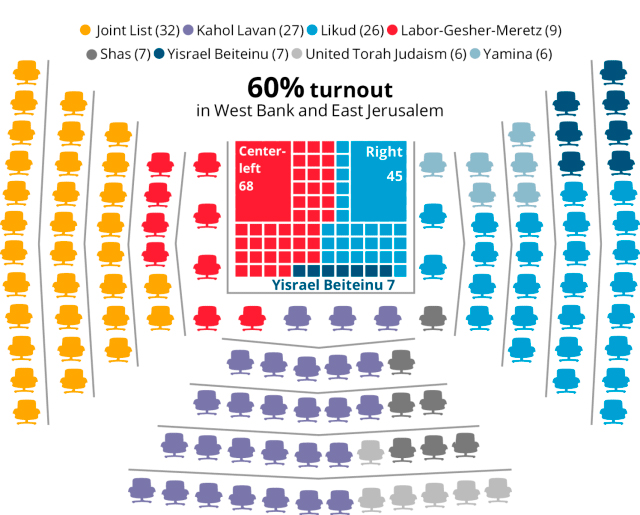 Slik kunne Israels nasjonalforsamling sett ut dersom palestinerne på Vestbredden og Øst-Jerusalem hadde stemmerett. (Graf: Ha’aretz)